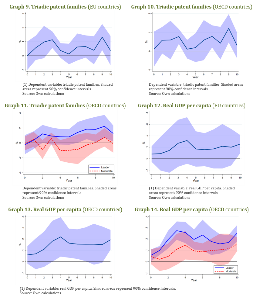 Economic activity. The long-term effect of an increase in public defence R&D spending on real GDP per capita is positive and significant (see Graph 12 to Graph 14). The cumulative impulse responses for GDP growth reveal a consistent positive effect for innovation leaders and moderate innovators, but with a net divergence in magnitude and persistence.