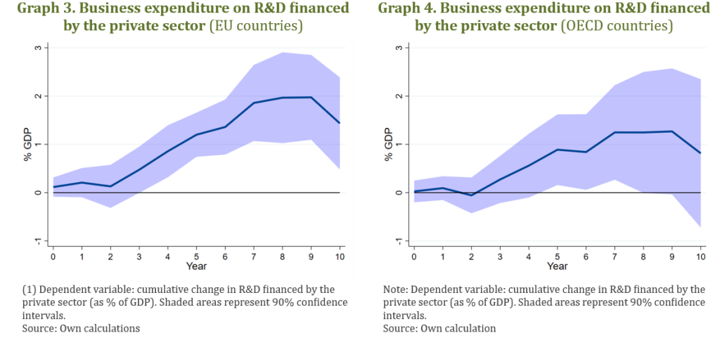 Private R&D investment. We first focus on the response of private R&D investment as a share of GDP. In the EU (Graph 3) and OECD samples (Graph 4), the response of private R&D investment is statistically insignificant in the years immediately following the public spending shock. However, a clear crowding-in effect emerges after a few years, allowing private investment in R&D to grow steadily and reach its peak around the ninth year after the shock. The cumulative increase in private R&D exceeds the initial shock, approaching 2% of GDP among EU countries18. This highlights a strong role of military-related innovation in stimulating broader innovative activity.