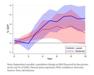 As expected, the magnitude of the crowding-in response is stronger and more durable in innovation leaders (see Graph 5). Accordingly, a common public R&D shock may deepen the innovation gap between more and less innovative countries, consistent with previous findings (see Tomasone et al. 2024)19.
