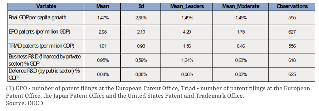 Table 1 shows substantial differences between innovation leaders and moderate innovators and suggests that a comparable shock to public spending in defence R&D may generate heterogeneous effects across groups.