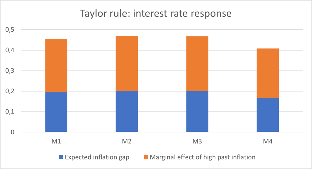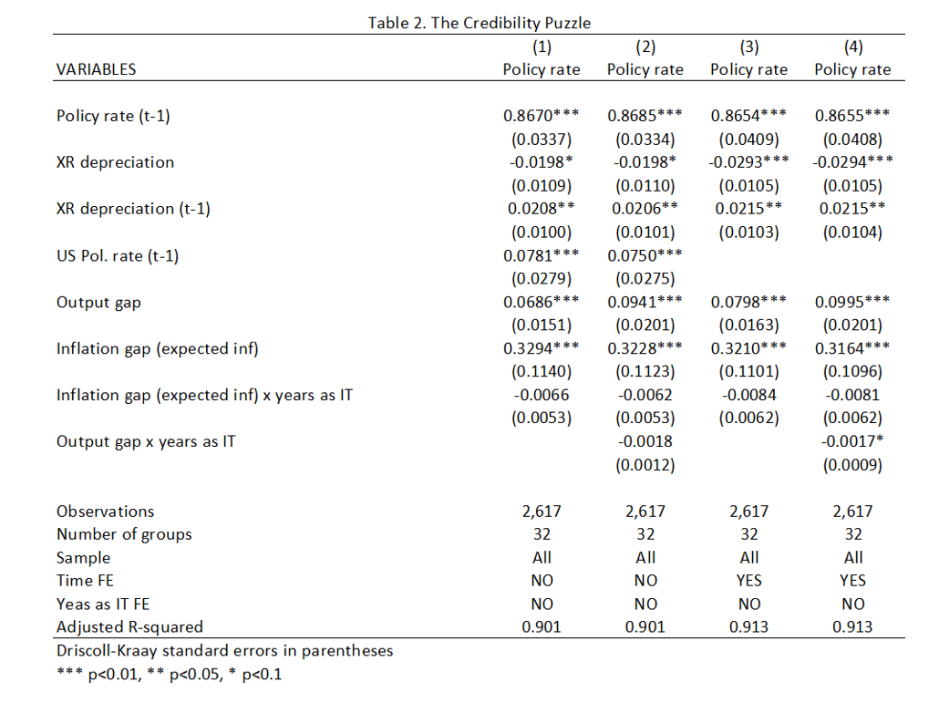 We also explore the stability of the inflation gap and output gap coefficients, as one would expect that as central banks build their credibility over time, they would need a smaller change in the policy interest rate for a similar size inflation gap shock. Our results show that the response of the interest rate to the expected inflation gap does not systematically vary over time (Table 2). In fact, a longer track record of consistent inflation targeting does not translate into smaller interest rate movements for similar expected deviation gaps, triggering the existence of what we label the credibility puzzle.