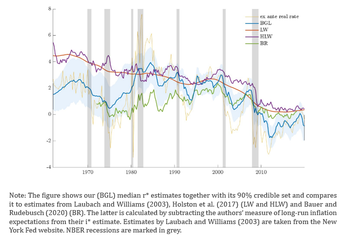 Our r* estimates for the US are shown in Figure 1. These estimates exhibit a distinct rise and fall over the past six decades, with a particularly steep decline following the Global Financial Crisis, as opposed to the steady decline reported by Holston et al. (2017), and more in line with Del Negro et al. (2017).
