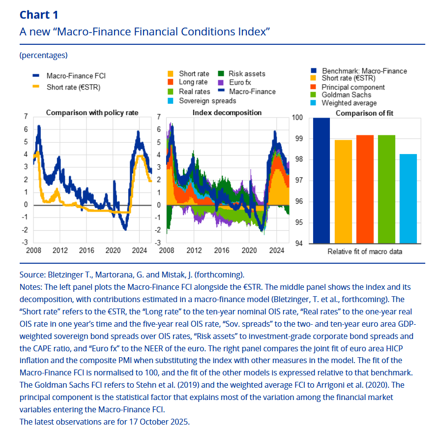 The new methodology incorporates mutual feedback between macroeconomic and financial dynamics, such that the Macro-Financial FCI reflects the joint dynamics of macroeconomic variables and financial conditions. As can be seen from the left panel of Chart 1, the overnight rate (€STR), which is closely tied to our policy rates, typically comoves with and sets the direction of the overall index. But there are also several phases in which financial conditions have moved even when the policy rate was stable (Chart 1, left panel).