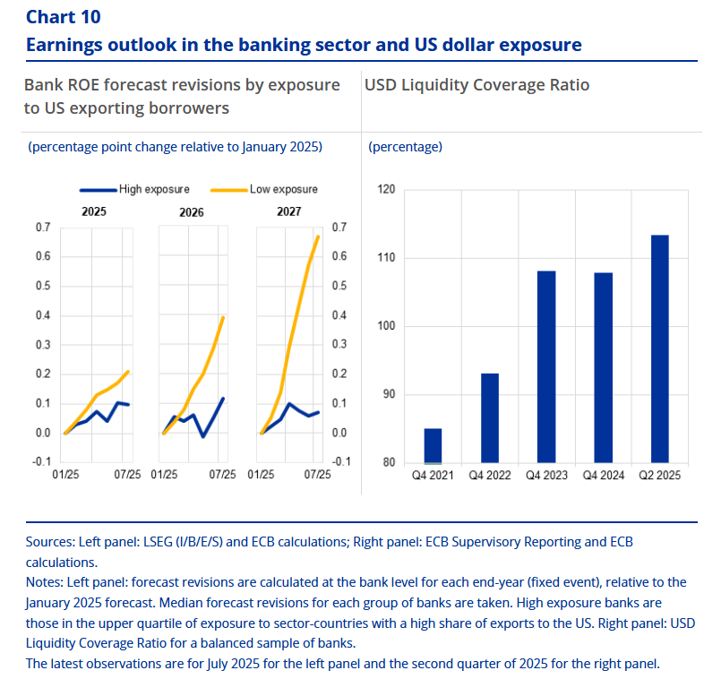 For credit supply, the net impact via the real economy depends on their client mix: institutions more exposed to tradable sectors may face tougher conditions, but banks with a high presence in the non‑tradable economy may benefit from the stronger purchasing power of their customers (Chart 8, panel B). On the one hand, market analysts are already discounting exposures to the United States in their estimates of euro area banks’ profitability prospects (Chart 10, panel A), despite the overall positive expectations for the sector.25 On the other hand, an appreciation of the euro improves the euro area’s terms of trade by lowering import prices, supporting real incomes and potentially making borrowers’ balance sheets stronger, eventually increasing banks’ willingness to serve customer segments benefiting from cheaper imports.