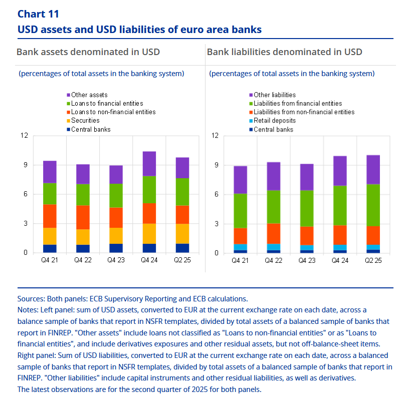 Moreover, euro area banks also have a substantial part of liabilities denominated in USD, with an interquartile range ranging between 7 per cent and 28 per cent as at the second quarter of 2025, and with a total amount similar to that of assets. A substantial share (43 per cent) of USD-denominated liabilities is provided by financial entities (Chart 11, panel B) and is therefore relatively volatile, especially during market turbulence. Overall, the net exposure in USD is rather stable over time: for banks with USD exposures, it is close to zero for the median bank and slightly negative in the aggregate at -2 per cent of banks’ assets. Moreover, reflecting the asset-liability management practices and the business models of banks with significant USD activity, net exposures are typically relatively unreactive to fluctuations in the exchange rate, policy rates or the business cycle. At the same time, the combined presence of substantial USD-denominated off-balance sheet exposures and volatile funding means that sudden changes in these net exposures cannot be ruled out. An increased probability of such a risk event would then generate pressures on both sides of banks’ balance sheets and potentially downward pressure on on-balance sheet exposures like loans to the real economy.31 Moreover, the composition of USD liabilities, dominated by funding from financial customers and with a limited share of retail deposits, can exacerbate these pressures by making funding more flight‑prone, thereby increasing vulnerability in a stress scenario.