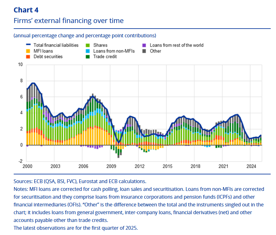 Looking in more detail at the sources of external financing for firms other than borrowing from banks, corporate bond issuance has benefited from foreign inflows into euro area bond funds in recent quarters, amid a shift in investor cross-border funds in favour of the euro area. Non-listed equities have also increased recently, likely reflecting activities of private equity funds. One segment of non-bank financing that has been growing significantly in recent years is private credit. Private credit generally refers to non-bank corporate credit provided through bilateral agreements or small “club deals” involving lenders outside the realm of securities investors or commercial banks. Despite a clear expansion in the euro area over recent years, the lion’s share of private credit is originated in the United States.8 Although numbers vary depending on the exact definition of private credit and source, the size of private credit in the United States is well above €1 trillion, while for the euro area numbers range from around €100 billion to around €300 billion.9 Taken together, non-bank financing has not grown enough to counteract the weakness in bank lending. The dynamics of all the sources of external finance for euro area firms, including equity financing, but also trade credit and non-bank financing, remain contained by historical standards (Chart 4), hence overall measures of the credit gap, as shown in Chart 3, remain negative.