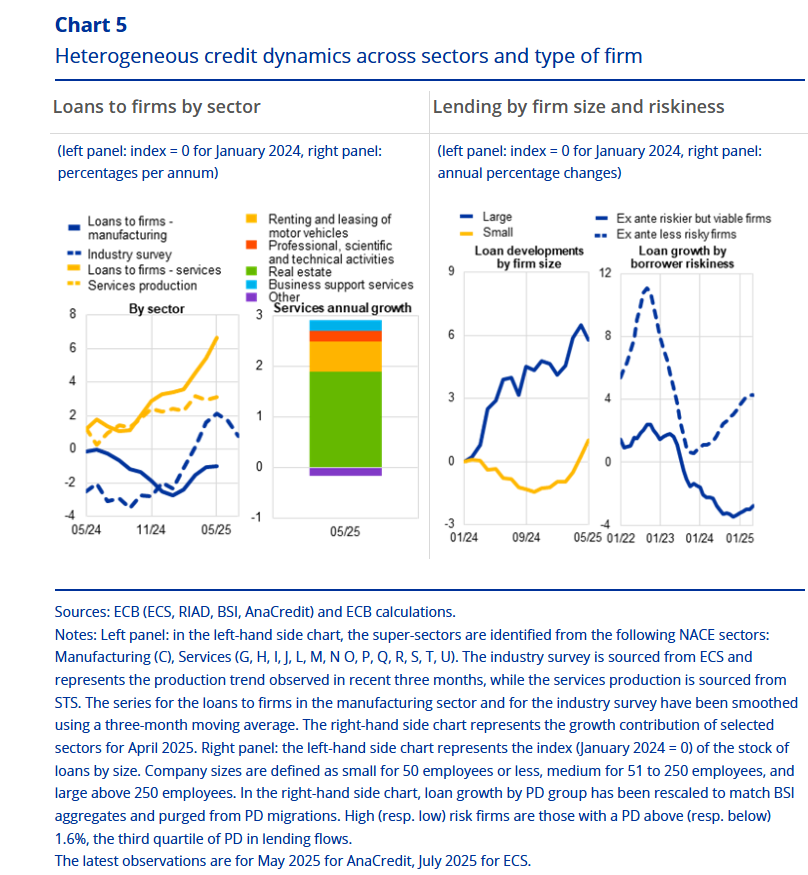 For instance, the growth rate of loans to the manufacturing sector, although recently supported by the surge in activity due to frontloading of euro area shipments to the United States, has been weaker than that of loans to the services sector (Chart 5, Panel A). As manufacturing is capital-intensive, this development connects to the anaemic growth in investment in recent years. Moreover, manufacturing is also working-capital intensive, and therefore especially affected by the cost channel of monetary policy. That a stronger recovery in the manufacturing sector has so far not materialised helps explain a weaker pass‑through of monetary easing via the cost channel than would normally be expected. The underlying reasons could be related to the greater exposure of manufacturing to the external environment, a topic that I will get back to later. By contrast, credit dynamics in the services sector have been driven largely by real estate and leasing activities, supported by recovering domestic demand for housing and durable goods in the euro area.