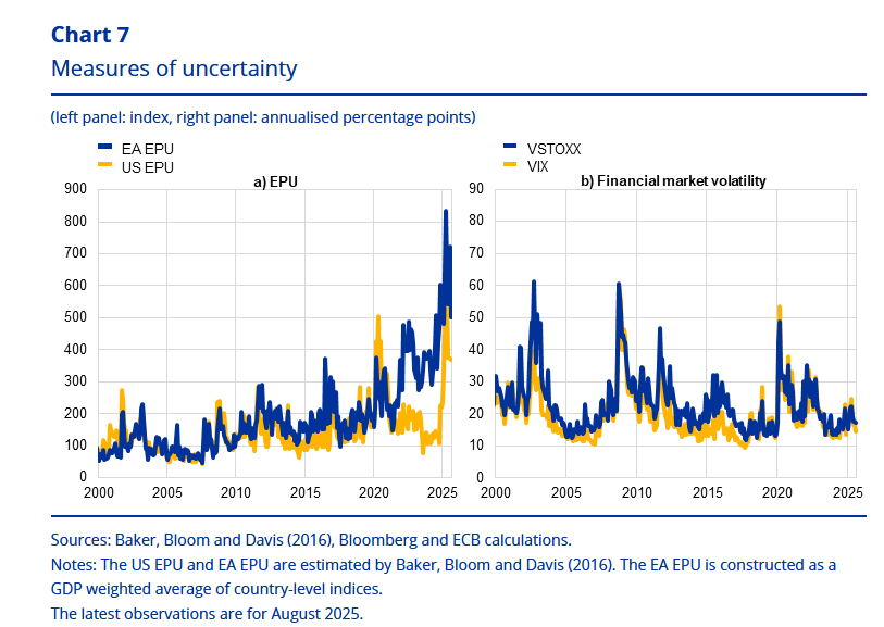 An important factor that may distort and at times suppress the transmission of monetary policy is uncertainty. Over the past year, economic policy uncertainty has risen sharply, reaching record levels in April, largely driven by trade tensions and geopolitical risks (Chart 7, left panel). Financial market volatility has, instead, remained subdued (Chart 7, right panel). While uncertainty has eased somewhat in recent months, it remains at historically high levels on both sides of the Atlantic according to newspaper-based measures, close to the peak seen during the COVID-19 pandemic.
