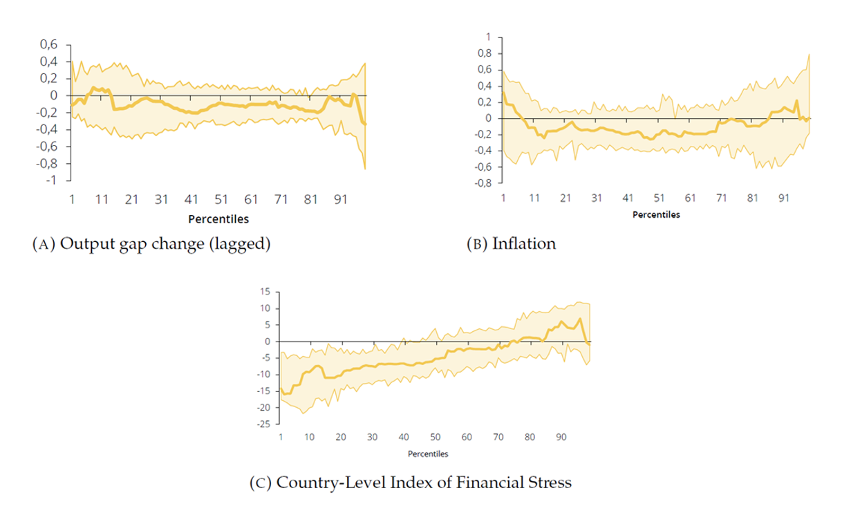 Note: results from one-quarter-ahead quantile regressions that include the current output gap change, inflation and the Country-Level Index of Financial Stress (CLIFS) as regressors. The shaded areas stand for 95% confidence intervals obtained using bootstrapping (xy-pair method) according to Davino et al. (2013). The estimated marginal effects are conditional on a one standard deviation increase holding constant all other regressors. Source: Banco de Portugal, authors’ calculations.