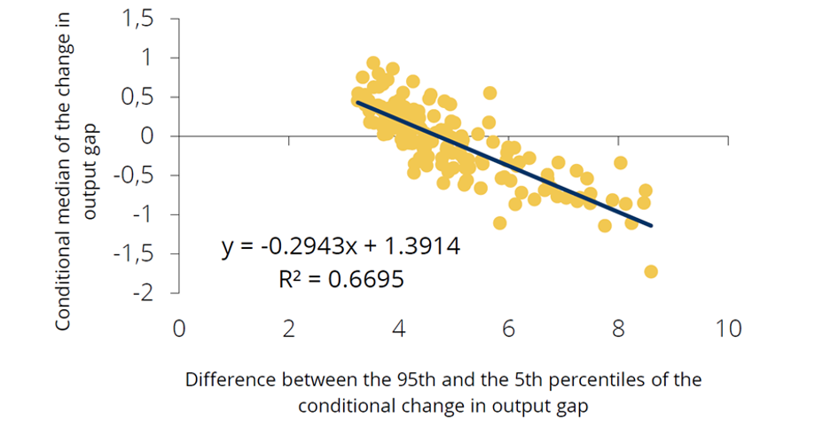 We can thus conclude that financial conditions, by driving the difference in volatility between the tails of the distribution of the output gap change, are responsible for the non-linear developments of the output gap change. An increasing volatility of the output gap change corresponds to higher probability of observing extreme negative output gap change realizations. Figure 3 shows that the volatility of the estimated distribution of the output gap change – measured as the difference between the estimated 95th and 5th percentiles – is negatively correlated with its conditional median. In other words, low realizations of the output gap change are associated with periods in which its extreme negative realizations are more likely to occur. The empirical results suggest overall that the output gap change volatility is not constant also for Portugal and that, similarly to the results from Adrian et al. (2020), this is due to financial conditions.