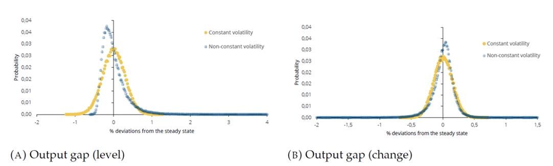 With more volatile financial conditions in fact, low volatility of the output gap today results in overall more volatile realizations of the output gap in the future compared to baseline specification with non-constant volatility. These dynamics translate into a more dispersed distribution of the output gap, with a higher probability of observing extreme values (positive and negative). The model in the specification with constant volatility is unable to capture this result, and for this reason, the non-constant volatility feature should be taken into account by policymakers.