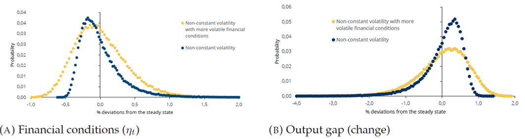 Figure 7 shows that the presence of more volatile financial conditions amplifies the intertemporal risk-taking dynamics in the model (panel in the left). In addition, the panel in the right shows that the simulated distribution of the output gap in the alternative specification with non-constant volatility and more volatile financial conditions is more volatile than in the baseline specification with non-constant volatility and less volatile financial conditions.