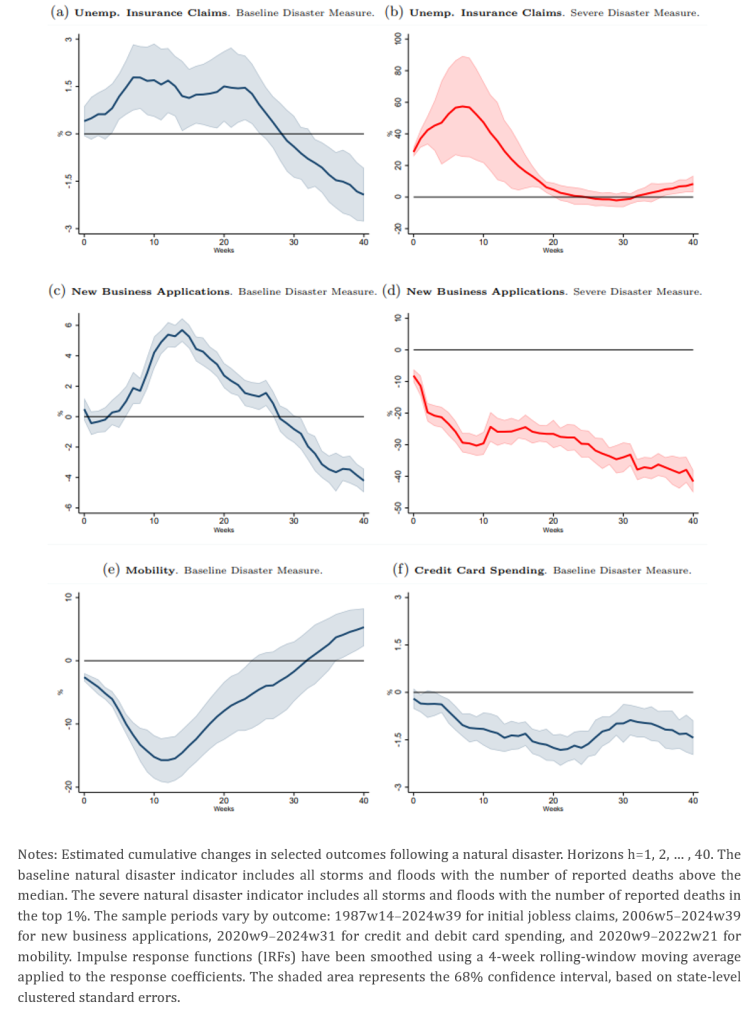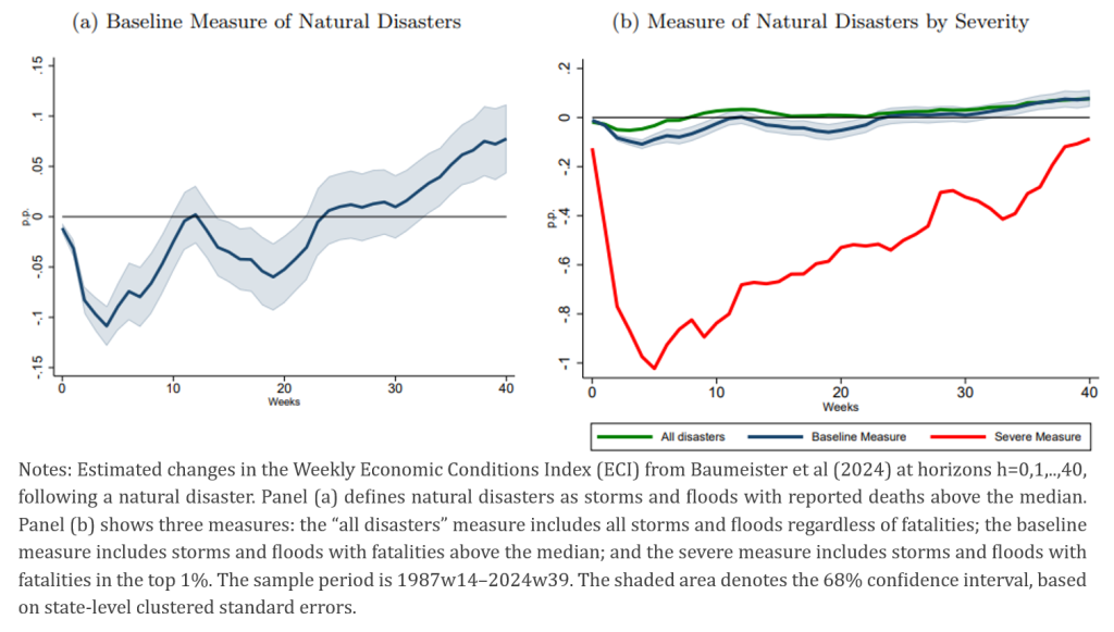 Panel (b) of Figure 1 shows that this impact varies widely with disaster severity. When we consider all storms and floods, including relatively minor events, the decline in activity is smaller and fades within a few months. By contrast, the most extreme disasters—those in the top 1% by fatalities—generate much larger and more persistent disruptions.