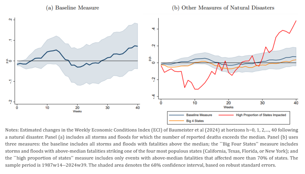 Panel (a) of Figure 1 shows how weekly economic conditions evolve in a state after a typical natural disaster. On average, activity weakens immediately and reaches its lowest point about four weeks after the event. The economy then grows more slowly for a period, but gradually returns to its pre-disaster average growth rate within five or six months. When we cumulate these weekly changes, the level of activity returns to its pre-disaster path within about a year, indicating that most disasters leave a clear but temporary impact rather than a permanent scar.
