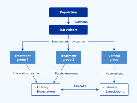 Note: The figure schematically illustrates the sampling process and the different treatment ECB visitor groups received during the experiment. Average treatment effects were computed for three outcome variables – monetary literacy, inflation expectations and growth expectations – by comparing the outcomes for participants receiving treatment with those for participants receiving no treatment.