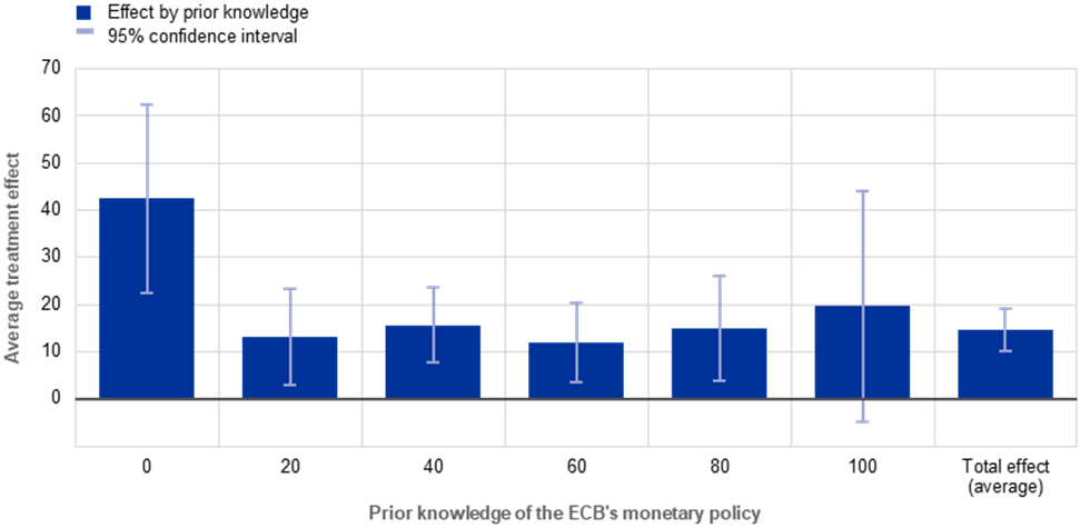 Note: The figure shows the breakdown of average treatment effects (ATE) for the total population and sub-groups with different levels of prior knowledge of the ECB’s monetary policy, notably the treatment group relative to the control group. ATE estimates, with regression adjustment, include controls for individual demographics such as age, gender, origin and education, for individual inflation and economic growth perceptions, and for prior knowledge.