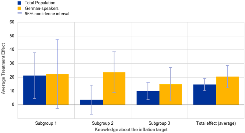 Note: The figure shows the breakdown of average treatment effects (ATE) for the total sample (blue bars) and the German-speaking sample (yellow bars), notably the treatment group relative to the control group by knowledge of the ECB’s inflation target. ATE estimates, with regression adjustment, include controls for individual demographics such as age, gender, origin and education, and for individual perceptions of inflation and economic growth.