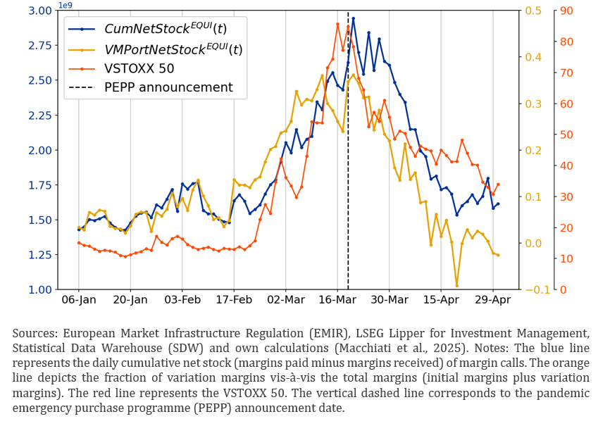 The Covid-19 crisis triggered the most severe stress in financial markets since the global financial crisis. In March 2020, equity and bond volatility surged and derivative margins rose significantly. For euro-area equity derivatives, required margins roughly quadrupled within weeks, and variation margin (which can be paid only in cash) reached nearly 40% of total margin stocks at their peak (Chart 1).
