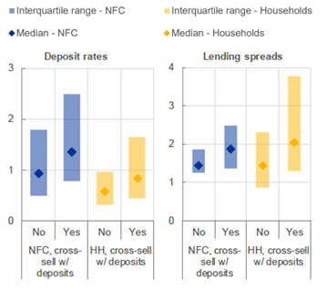 Source: Basten and Juelsrud (2025). Notes: The left-hand panel shows deposit rates paid to clients and the right-hand panel shows lending spreads charged. In each panel, the first two dots and bars capture bank relationships with non-financial corporations (NFCs), the other two capture relationships with households (HHs). In each case, “Yes” refers to banks who in a survey administered by the SSM say that cross-selling matters for their pricing, whereas “No” refers to banks that say it does not. In all cases, the dot shows the median, while the bar shows the interquartile range.