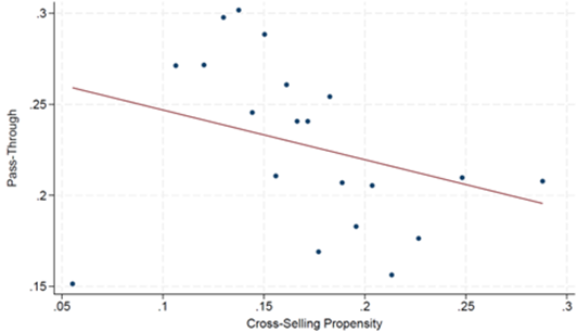 Source: Basten and Juelsrud (2025). Notes: We first estimate cross-selling propensity for each individual bank-household relationship. Then we compute average pass-through and average cross-selling propensity at the level of each bank. Finally, this bin-scatter figure plots mean pass-through against mean cross-selling propensity with a separate dot for each group of banks with similar cross-selling propensity.