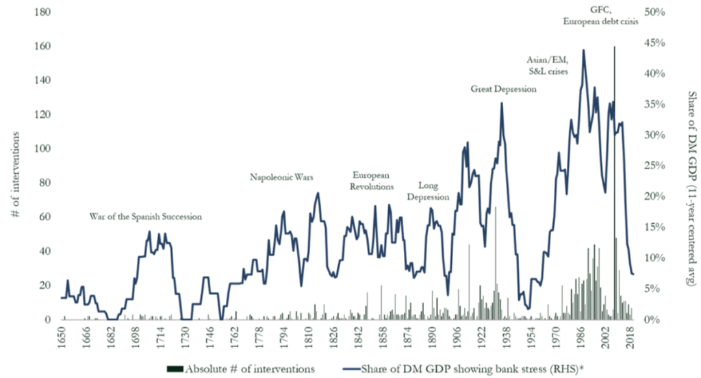 Over the past century, there has been a significant increase in the scale and scope of central bank interventions in response to banking crises, alongside the introduction of public insurance schemes such as deposit insurance (Bordo and Siklos, 2018; Metrick and Schmelzing, 2021, especially Figure 1 reproduced below). In particular, since World War II, central bank policy responses to financial crises have become “close to systematic” (Ferguson et al., 2023). Puzzlingly, despite the presence of ex-ante public backstops and large-scale public liquidity provision ex post, significant banking crises continue to occur across the world (for example, as shown in Figure 2 from Reinhart and Rogoff (2013) below), including in advanced economies with comprehensive regulatory frameworks (as evidenced by the widespread recent banking stress around the failure of Silicon Valley Bank in 2023). Why?